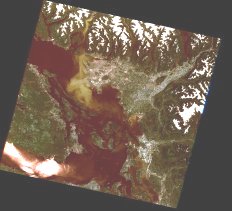 The second image shown to the right is a Landsat ETM composite of the Puget Bay area of the Northwestern United States constructed by combining the 1, 2, and 3 bands in RGB order. Below it is a full scale 30m resolution chip from the large Landsat ETM image shown immediately above it. Note the wake of the ocean-going vessel at the upper left of the image.