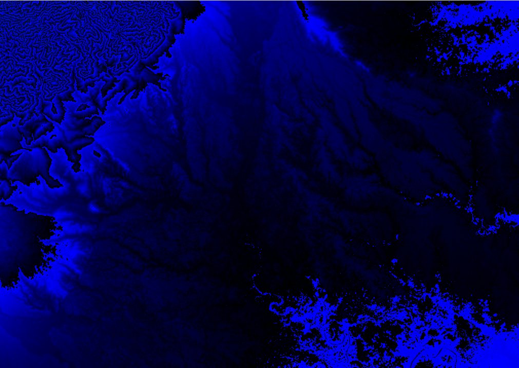 (Note about the coloration of the images in the following article: When I added SRTM and ASTER file handling capability, I chose to map the elevation values directly to RGB space without any transformations. As a result, elevations near zero will map to black. In addition, smooth transitions in elevation will not necessarily result in smooth transitions in RGB space, resulting in some bizarre DEM renderings. I will probably transform the elevations to gray scale space in future versions. This is more complicated than it should be, mainly because I am starting to load BLACKART with a lot more features and capability than I had originally planned for. As a result, each new addition requires a lot of programming to prevent unwanted side effects from occurring in the originally planned modules.)
