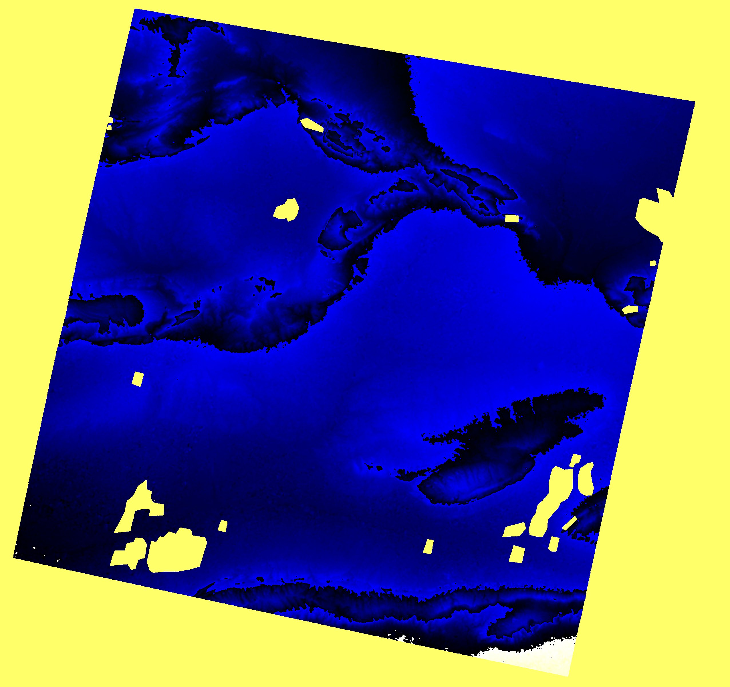 The next image shows a typical ASTER DEM. ASTER is notorious for its huge null data regions. (Sometimes there is more missing data than good data.) This is probably because the ASTER instrument is essentially a visible spectrum sensor. It is easily fooled by low-contrast areas like snow fields and it cannot see through clouds. All of the null-data areas in this file (ASTER_DEM20020108123405.hdf) have elevation values of -150m. Unfortunately, ASTER images include a collar area because although the borders of the image are approximately aligned with true north, the valid data region is aligned with the path of the Terra satellite. The collar is always null data too, of course. In order for the collar to be removed, the whole file needs to be rotated so that the valid data region can be cropped out. This is a somewhat tricky operation and is at the moment beyond the capabilities of BLACKART. For this exercise I had to be content with working with a subset of the larger image cut from an area completely inside the valid data region in order to get around this problem. However, the last section of this article shows how to run a subset interpolation without cutting the subset from the DEM.